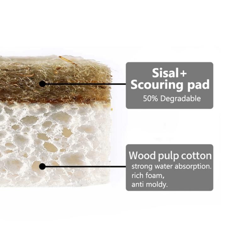Spúinse cistine éicea-chairdiúil agus saor ó bholadh a thabhairt isteach. Ní bhailíonn siad drochbholadh agus baictéir mar spúinsí poileistear agus éadaí sintéiseacha. Mar gheall ar chruas agus nádúr scríobach snáithín sisal, úsáidtear é sa chuid sciúradh dár spúinsí plandaí-bhunaithe. Tá an spúinse cistine seo déanta as ceallalóis laíon adhmaid (cuid bán), agus 50% snáithín sisal nádúrtha, polúireatán 50% (cuid buí) le haghaidh sciúradh tromshaothair.