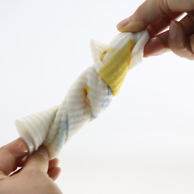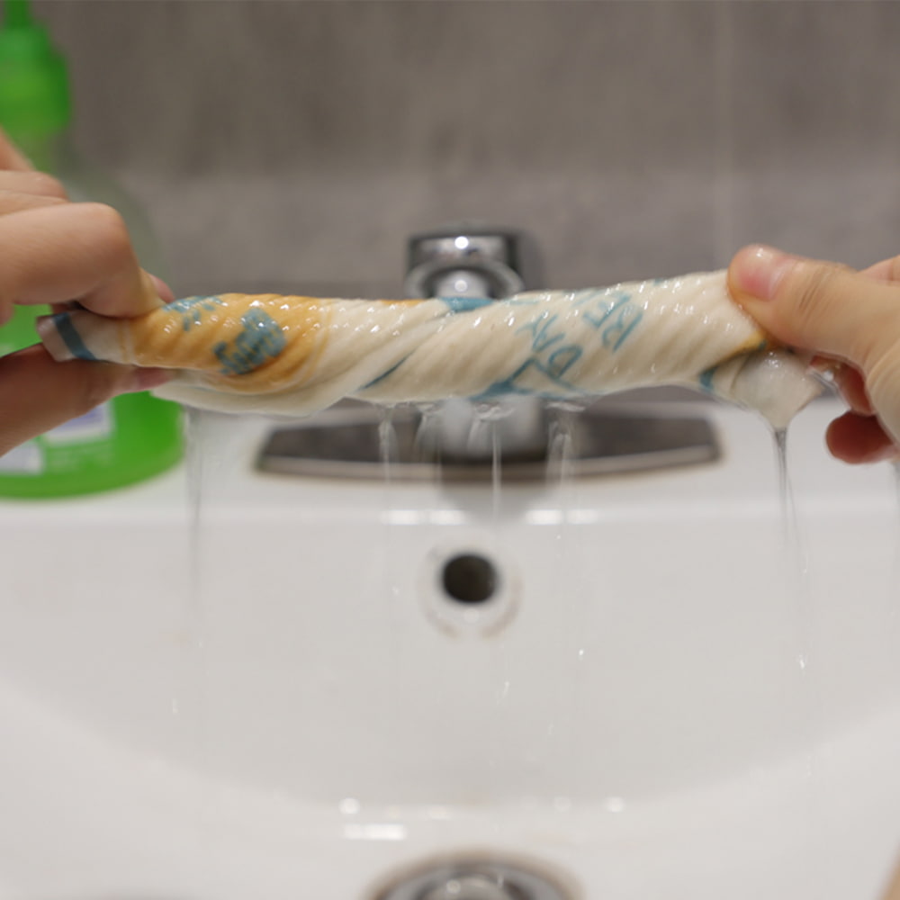 At uisce: Tá an struchtúr snáithín scaoilte agus scagach. Nuair a bhíonn sé faoi lé uisce, leathnaíonn sé go tapa agus tiúsaíonn sé, le cumas ionsú uisce thar a bheith láidir. Triomaíonn sé go tapa agus ní fhágann sé marcanna uisce.